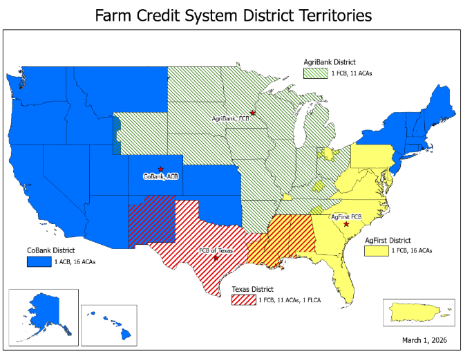 NOTE: As of March 1, 2026, CoBank funds 16 associations in the indicated areas and serves cooperatives nationwide; Farm Credit Bank of Texas funds 12 associations; AgriBank, FCB, funds 11 associations; and AgFirst Farm Credit Bank funds 16 associations. The Farm Credit System contains a total of 59 banks and associations.